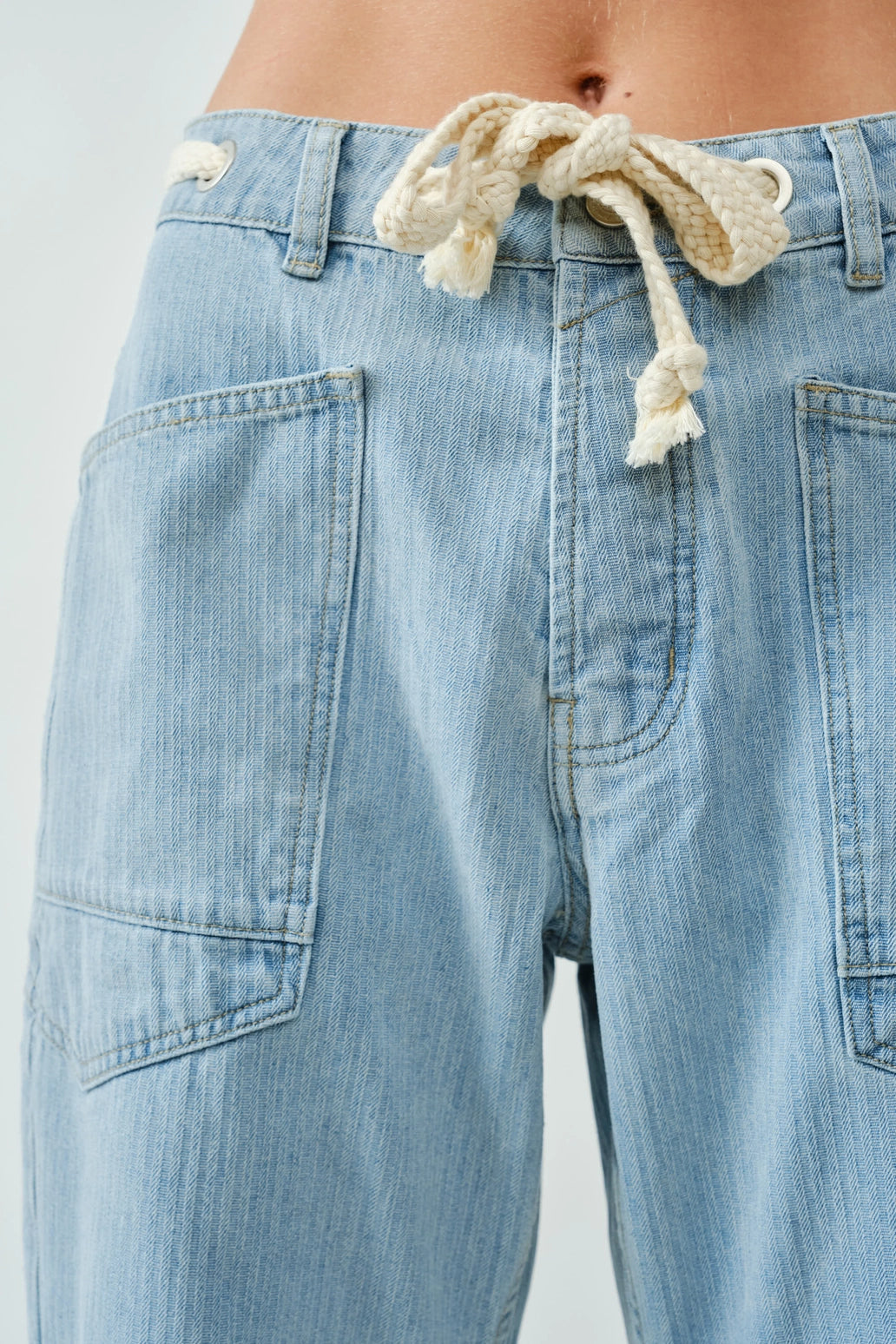Theses jeans are the perfect unique pair. feature a tapered barrel silhouette and slouchy fit. Featuring a light wash denim and subtle stripes.