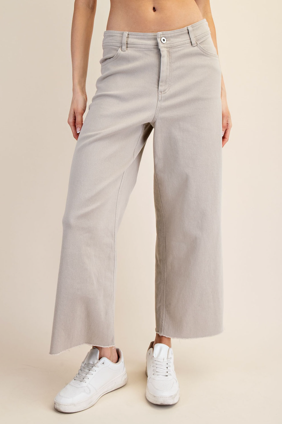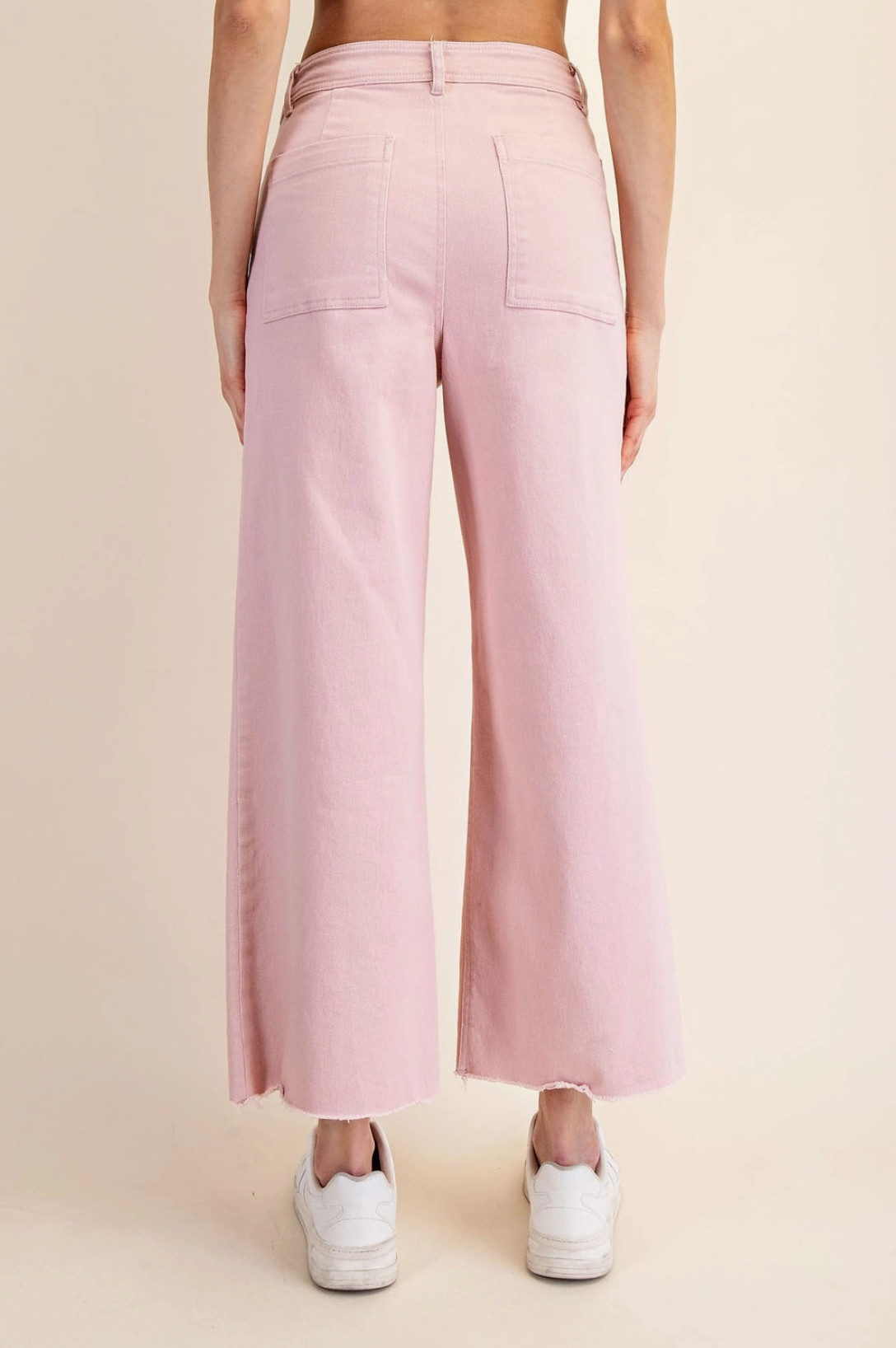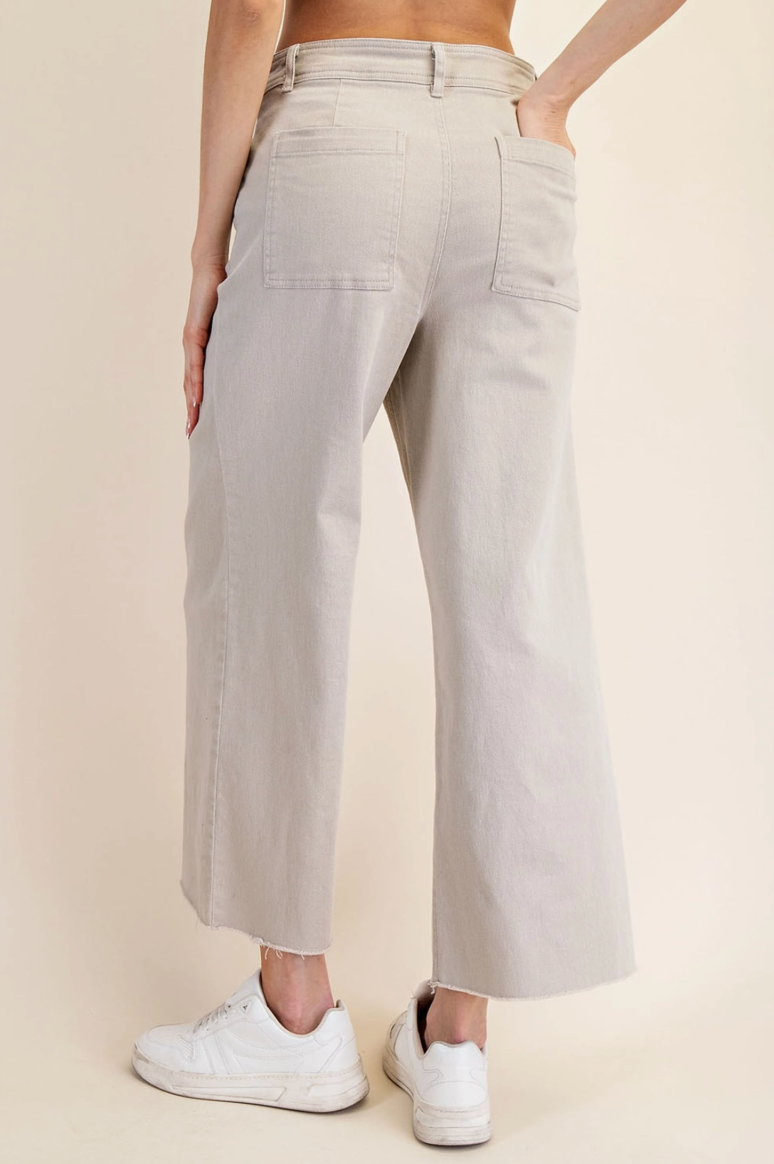 Features: - Cotton twill fabric - Relaxed fit - High-rise / High waist - Ankle length - Wide leg - Raw edge hemline - Front side pockets - Back patch pocketsĀ