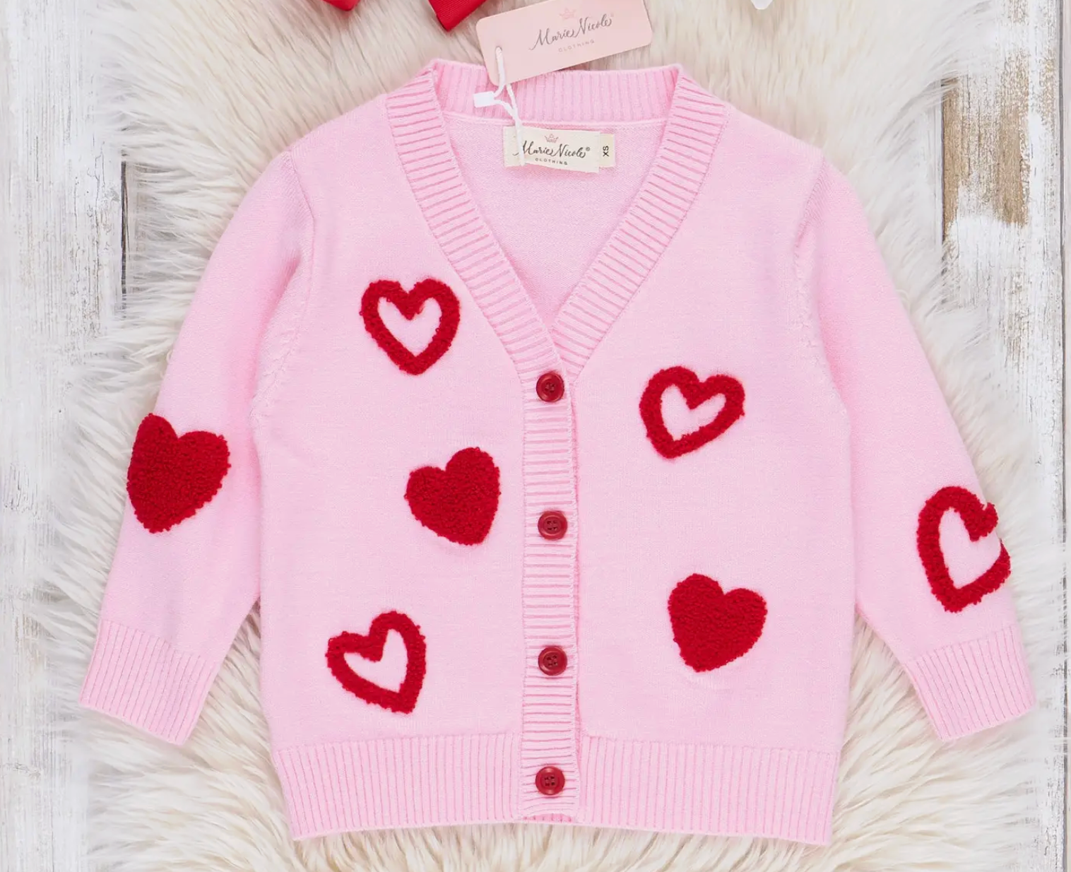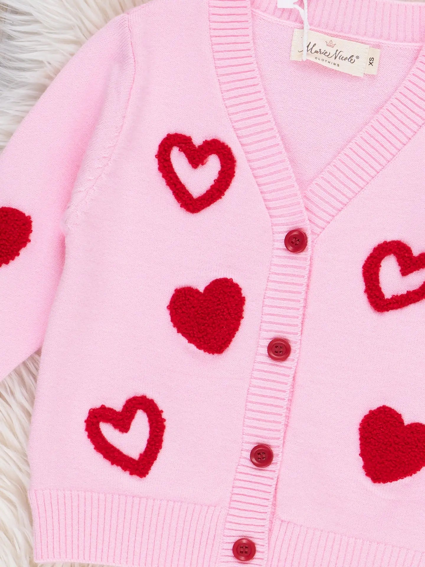 Bring some love to your little fashionista's wardrobe with this perfectly pink cardigan featuring adorable red heart patches and sweet red button accents. The Little Sweetheart Cardi is soft, comfy, and cozy, perfect for Valentine's Day or any day of the week!