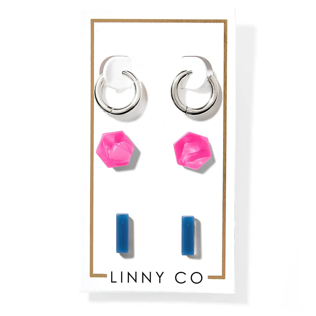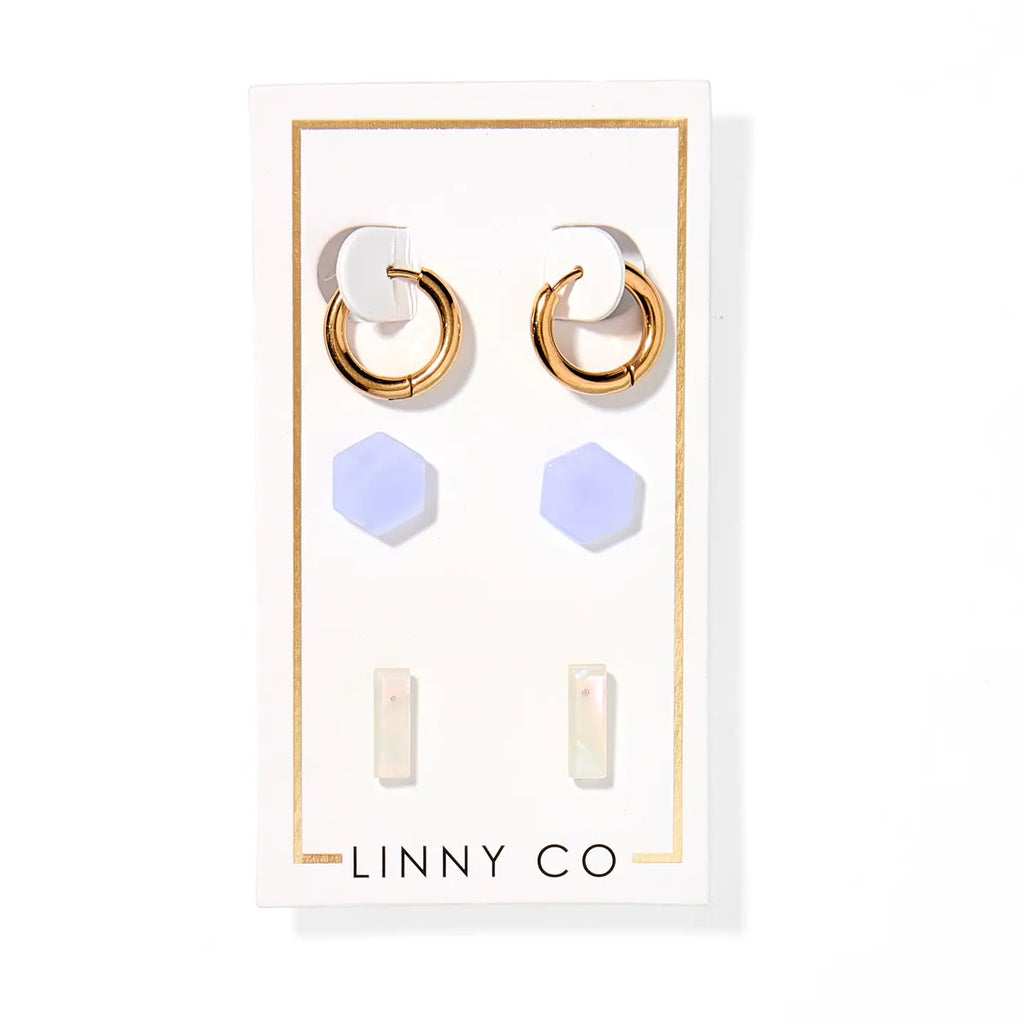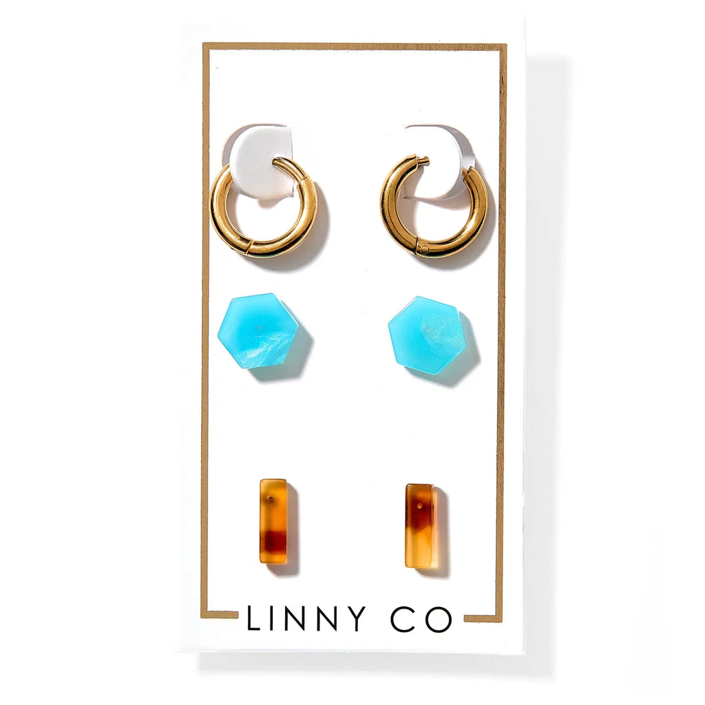 LINNY CO jewelry is safe for sensitive ears, light weight and made to last. Made from 100% surgical-grade stainless steel and eco-friendly acetate, LINNY CO is always copper and nickel free. Our stud trio's feature various acetate studs with stainless steel posts. All studs are 12mm or smaller.