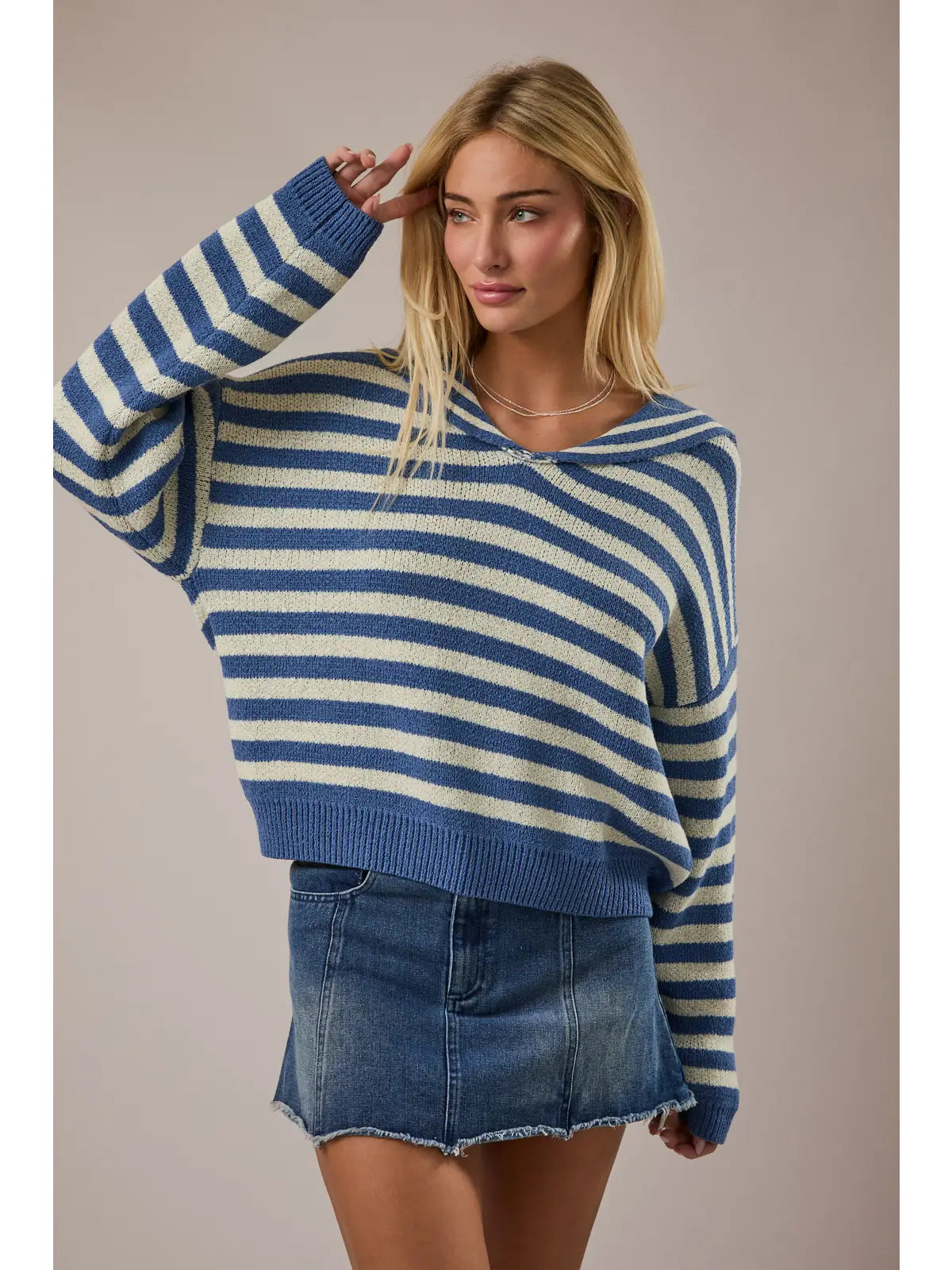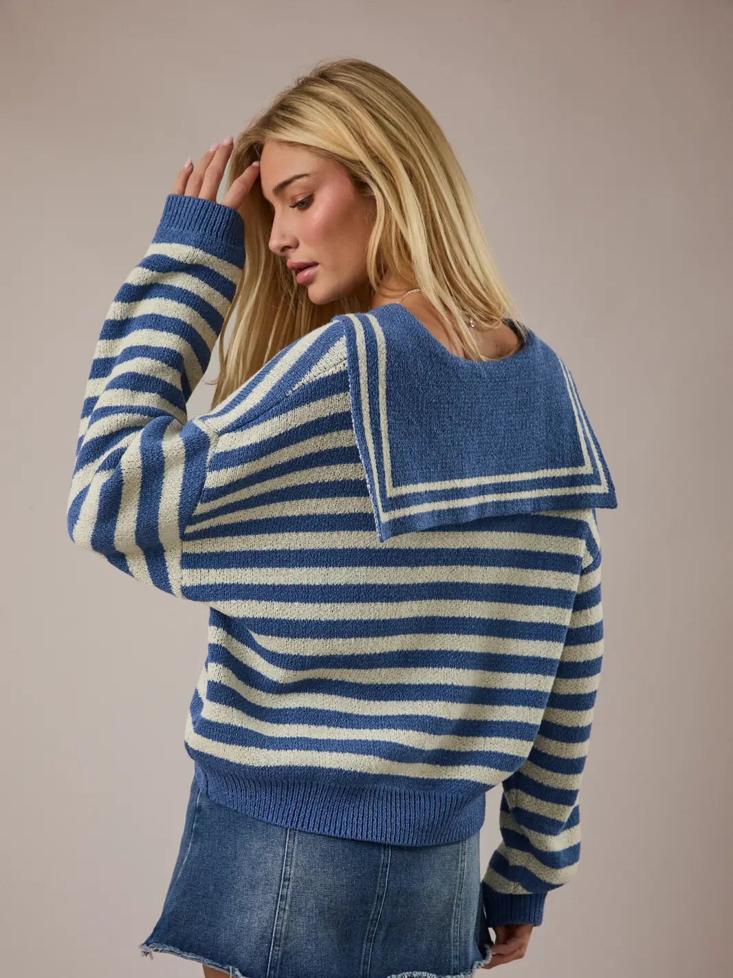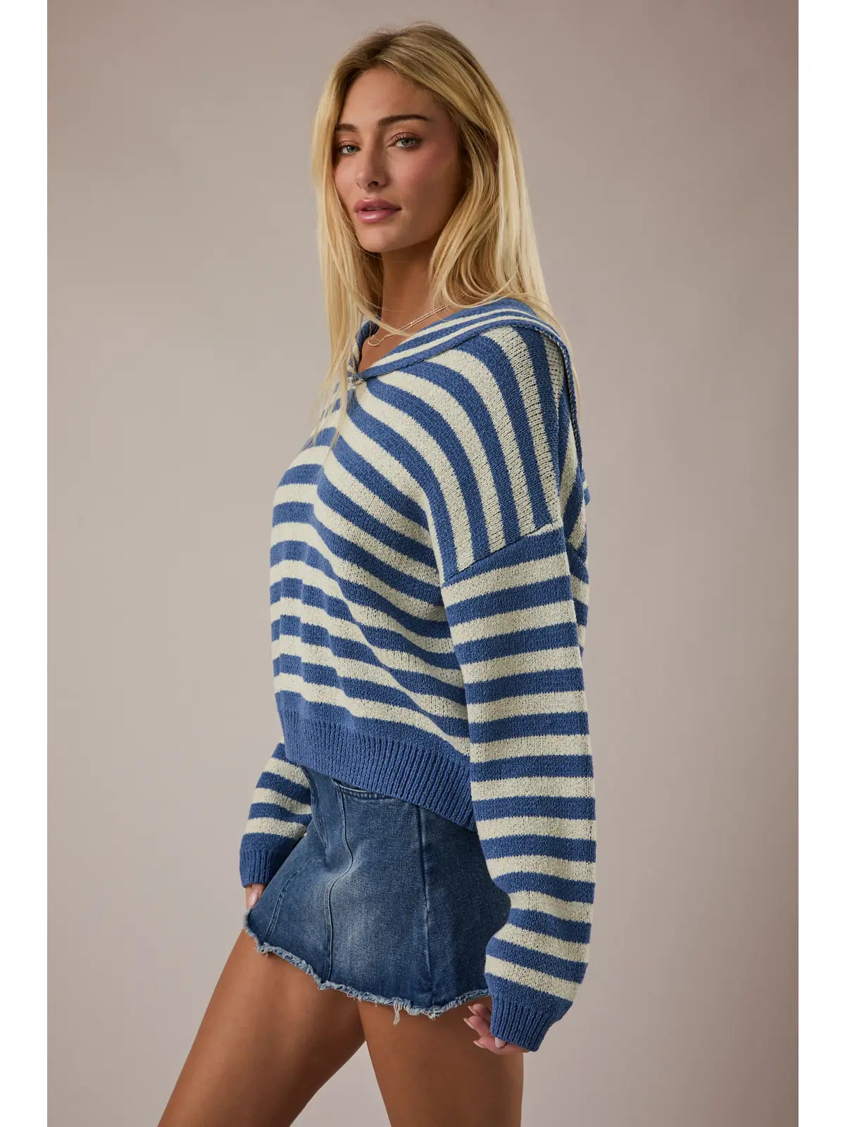 Soft, and lightweight, this sweater features a nautical sailor collar, drop sleeves and a moderately cropped fit.