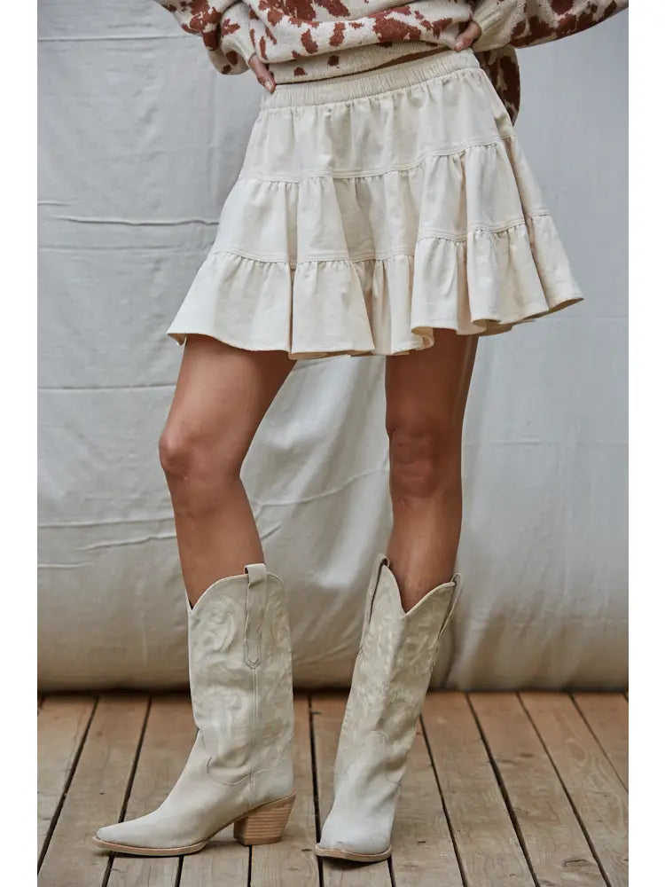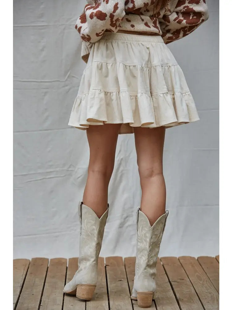 Adorable high-waist, corduroy mini skirt featuring an elastic waist band and tiered design.