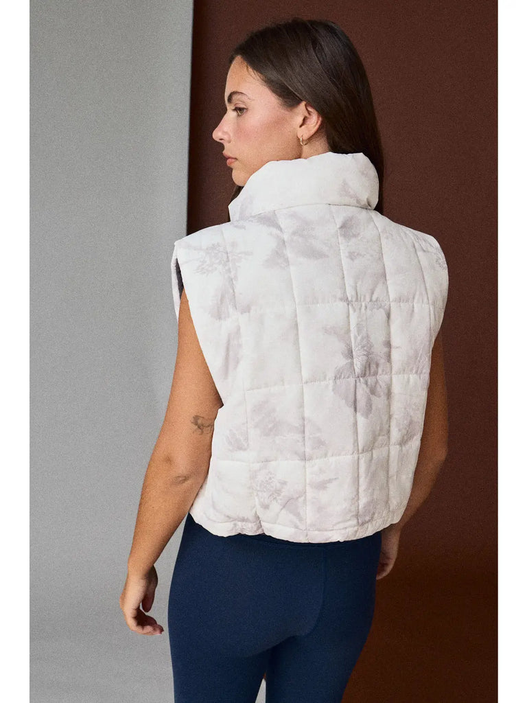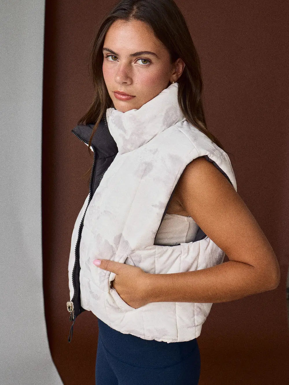 Reversible with a unique design detail on one side, and charcoal gray on the other. High quality and warmth cropped puffer vest with a zipper front.