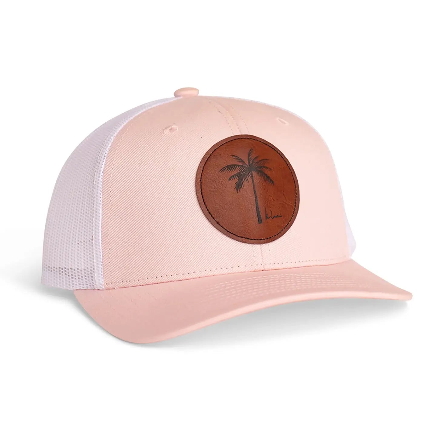 K Lani trucker hat. Pale plink with a leather patch detail. One Size
