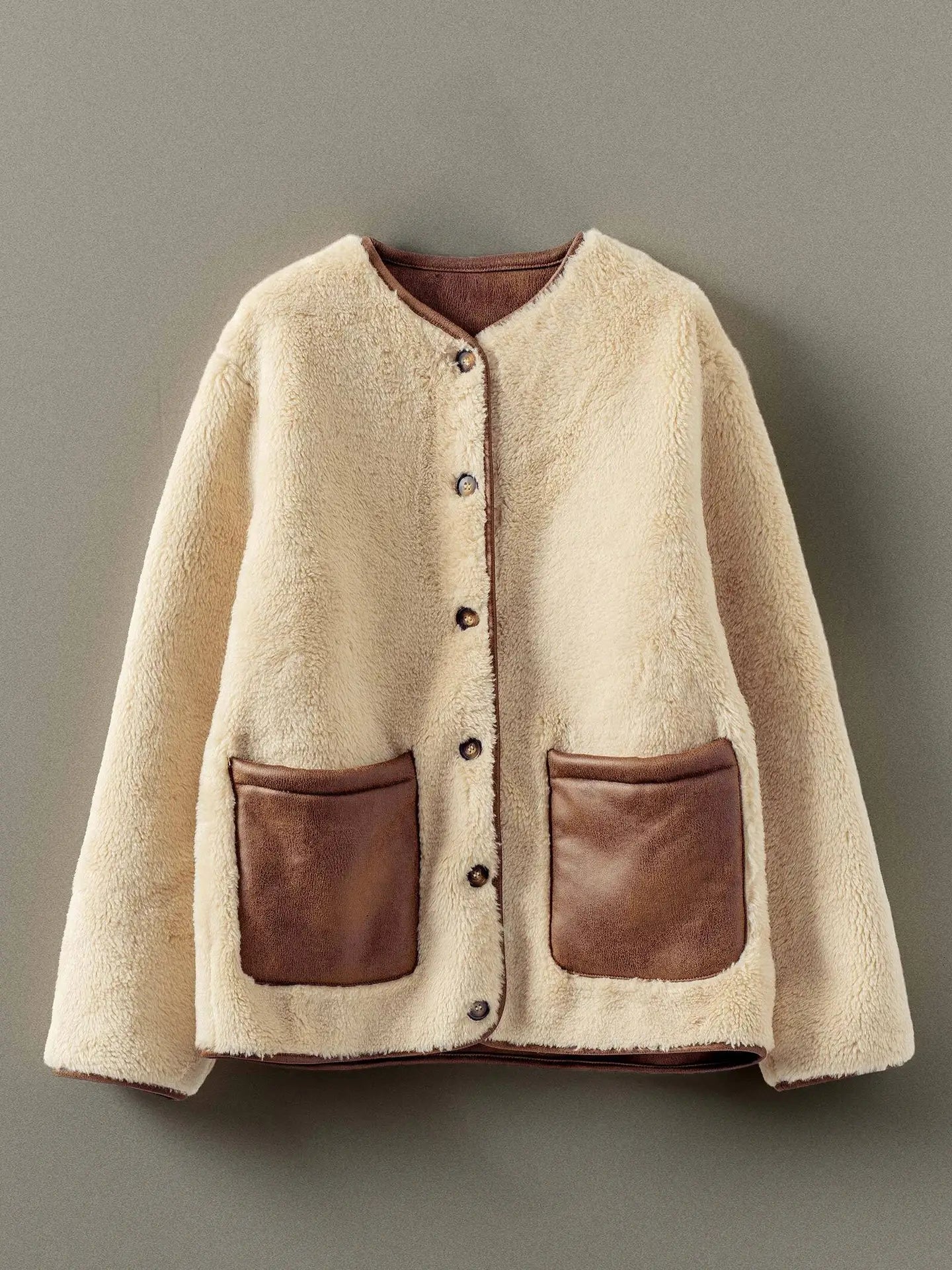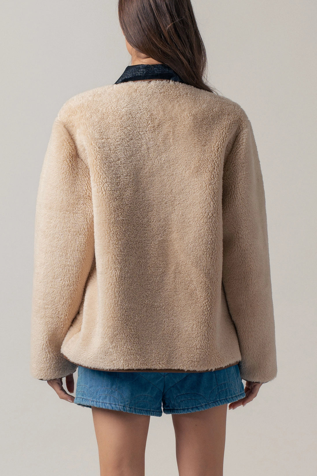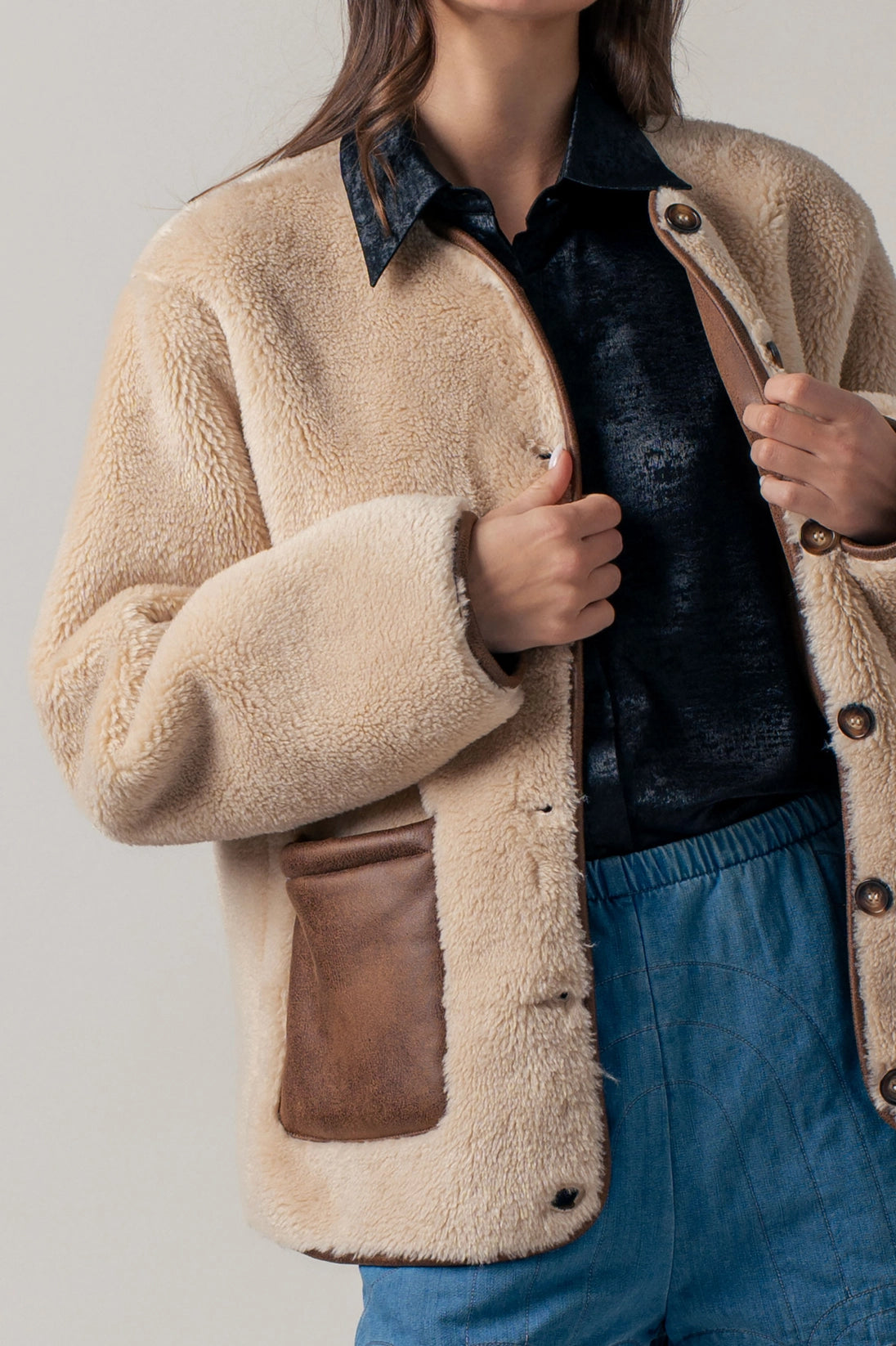 Wrap up in cozy comfort with our plush faux shearling jacket, designed to keep style and warmth in perfect balance. Featuring smooth faux suede patch pockets for a touch of luxe contrast, this jacket combines casual ease with elevated details.