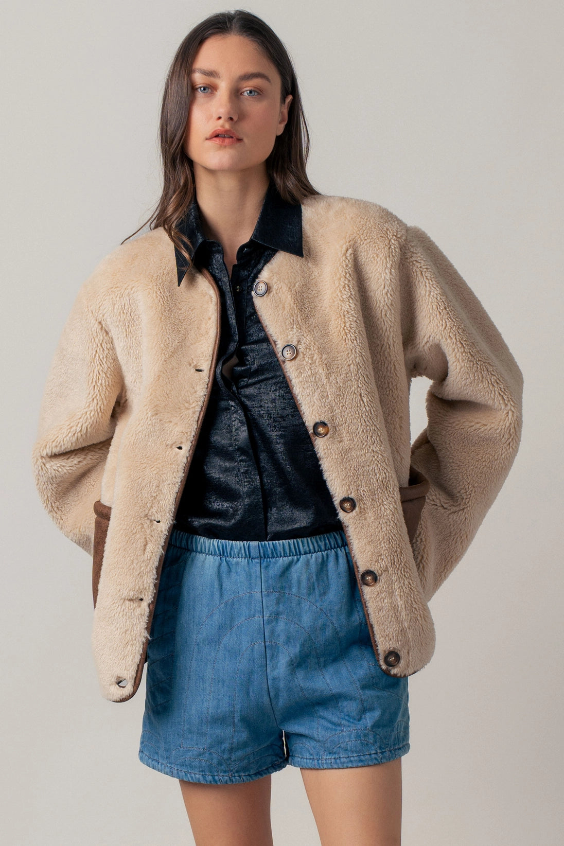 Design: Plush faux shearling body with a full button-front closure. Fit: Relaxed, boxy fit with drop shoulders for easy layering. Details: Features two smooth faux suede patch pockets and long sleeves.