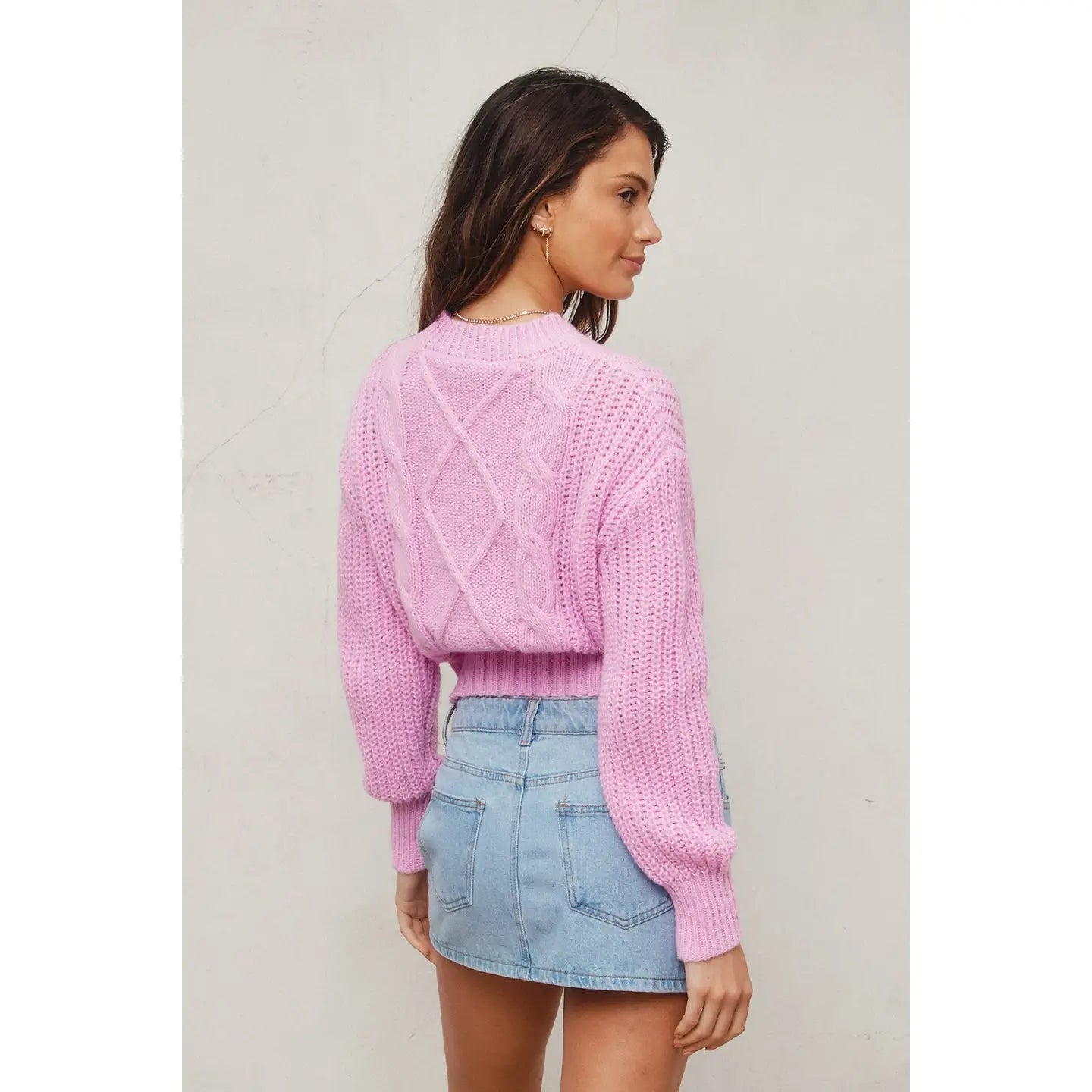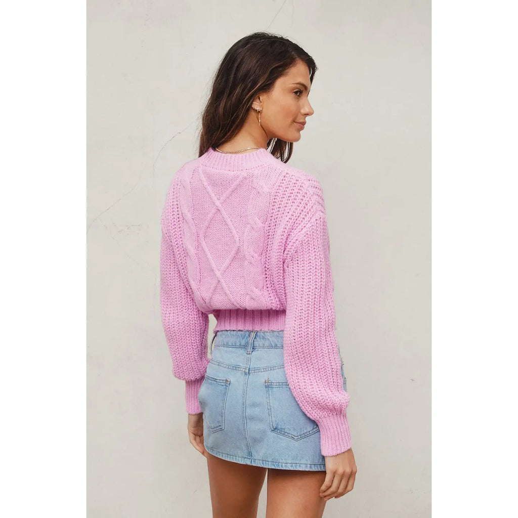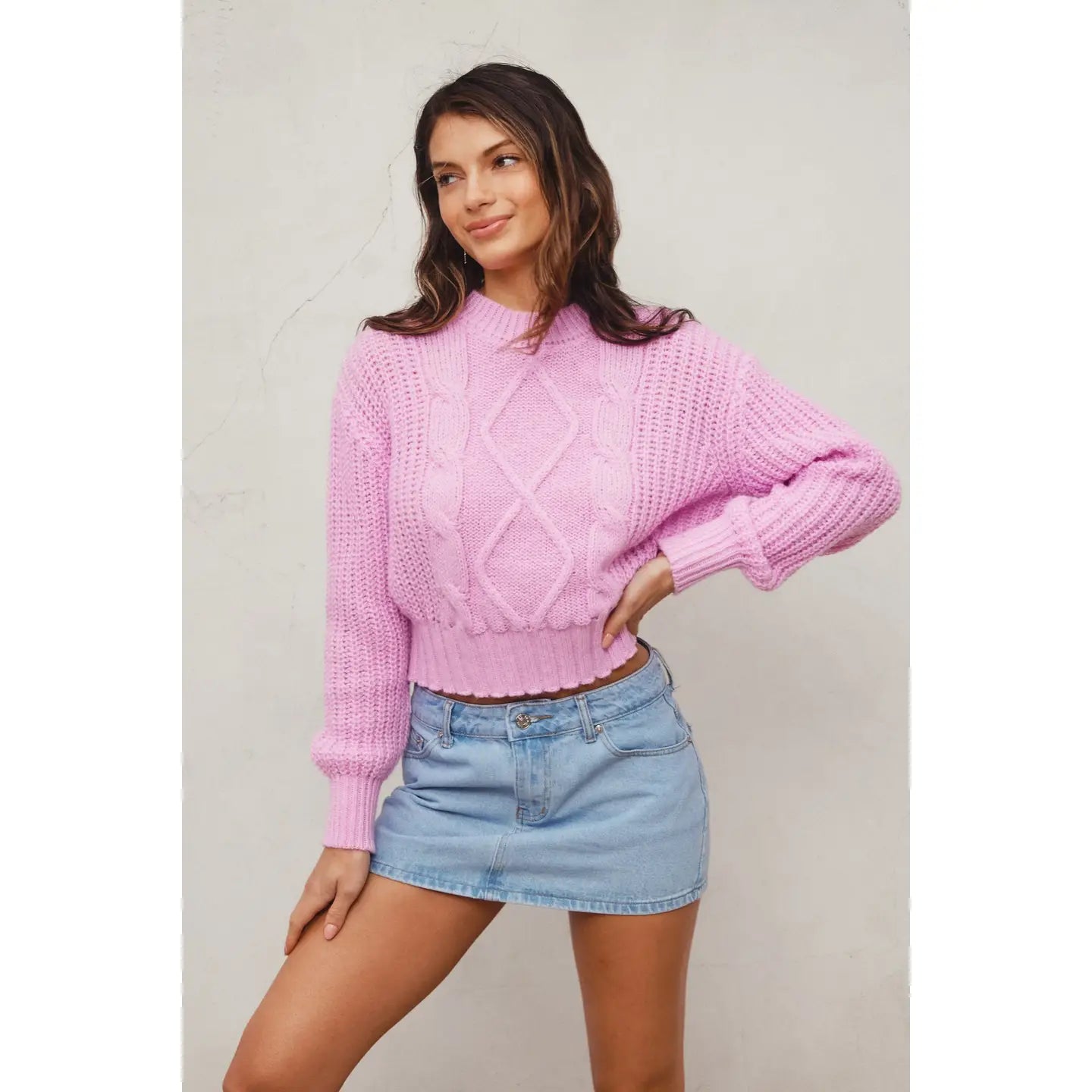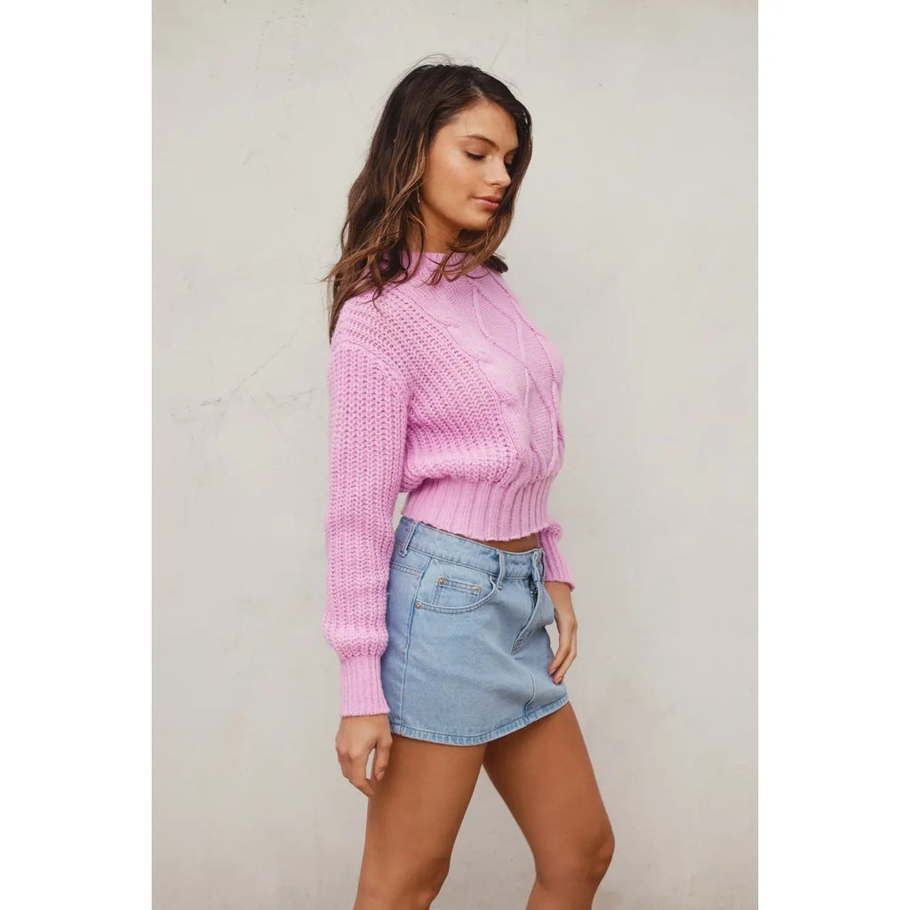Cable knit sweater in cropped length. Models are 5'7" and wearing size Small. - Crew neck - Ribbed trim - Cable knit detail - Cropped - Unlined Shell: