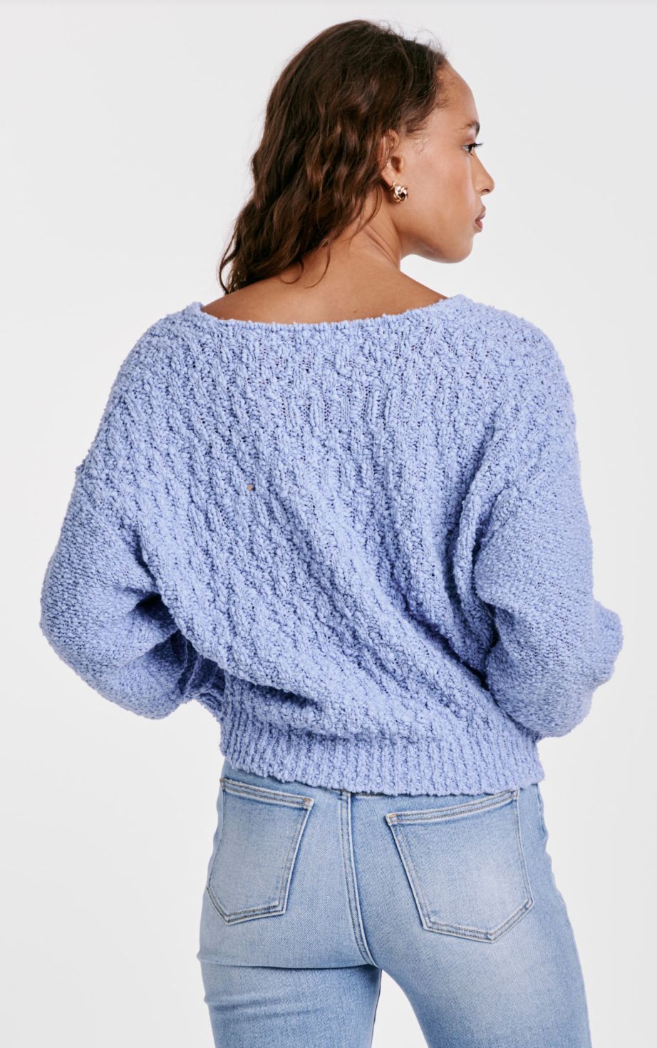 Drop shoulder sweater, long sleeve v-neck finished in chunky cable braid & pointelle weave.