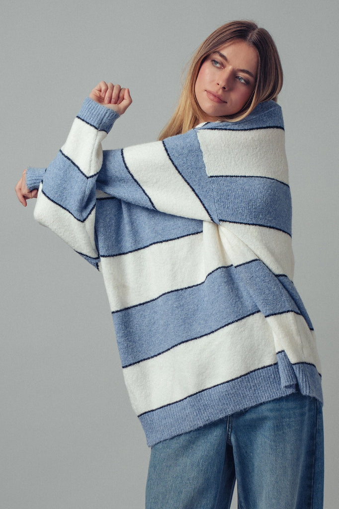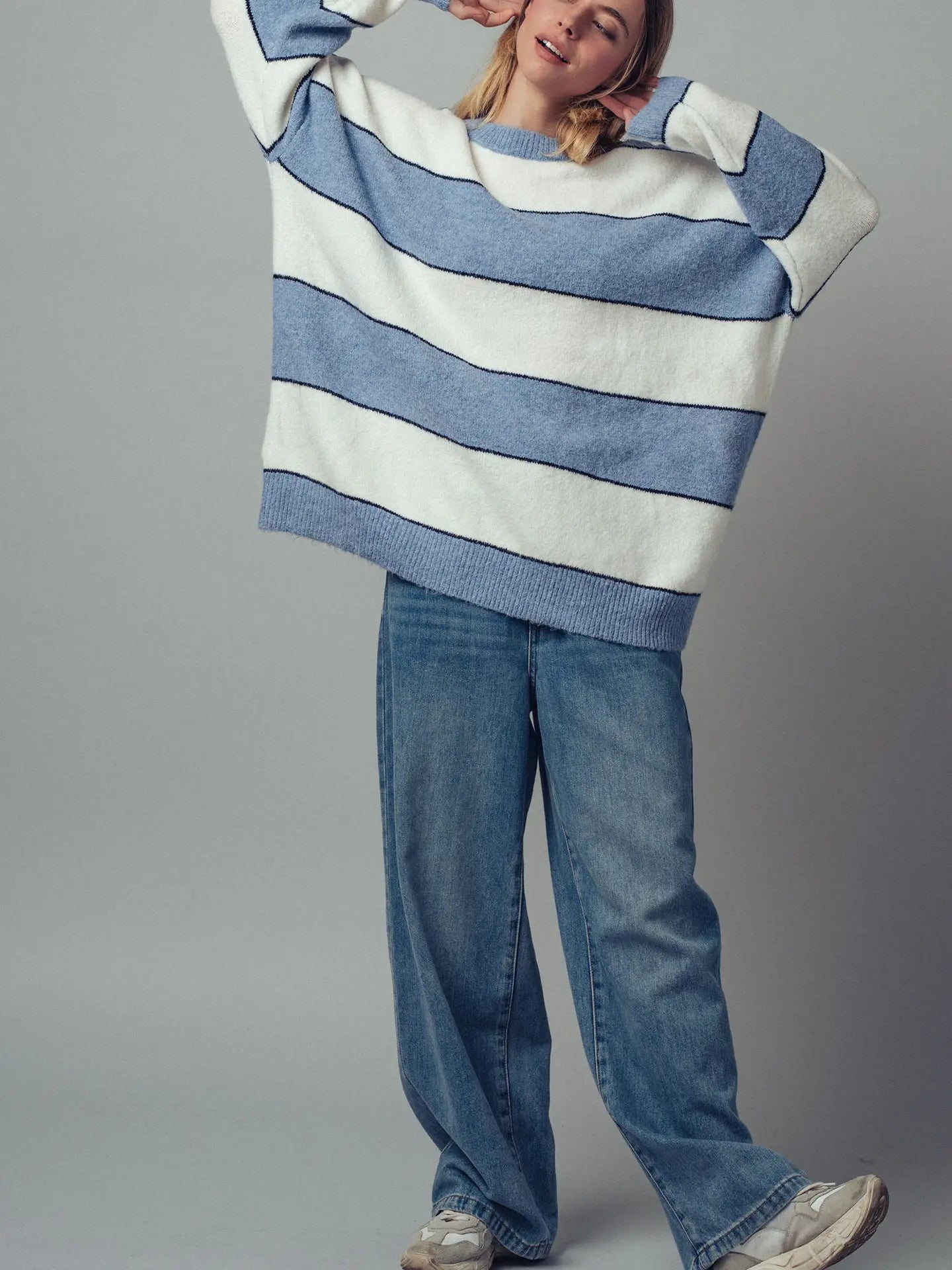 Channel a cool, casual vibe with this effortlessly slouchy striped sweater. Crafted from a soft, plush knit blend for ultimate comfort, it features a bold rugby stripe pattern for a timeless yet graphic look. The intentionally oversized fit and dropped shoulders make it a go-to statement piece for cozy, everyday style.