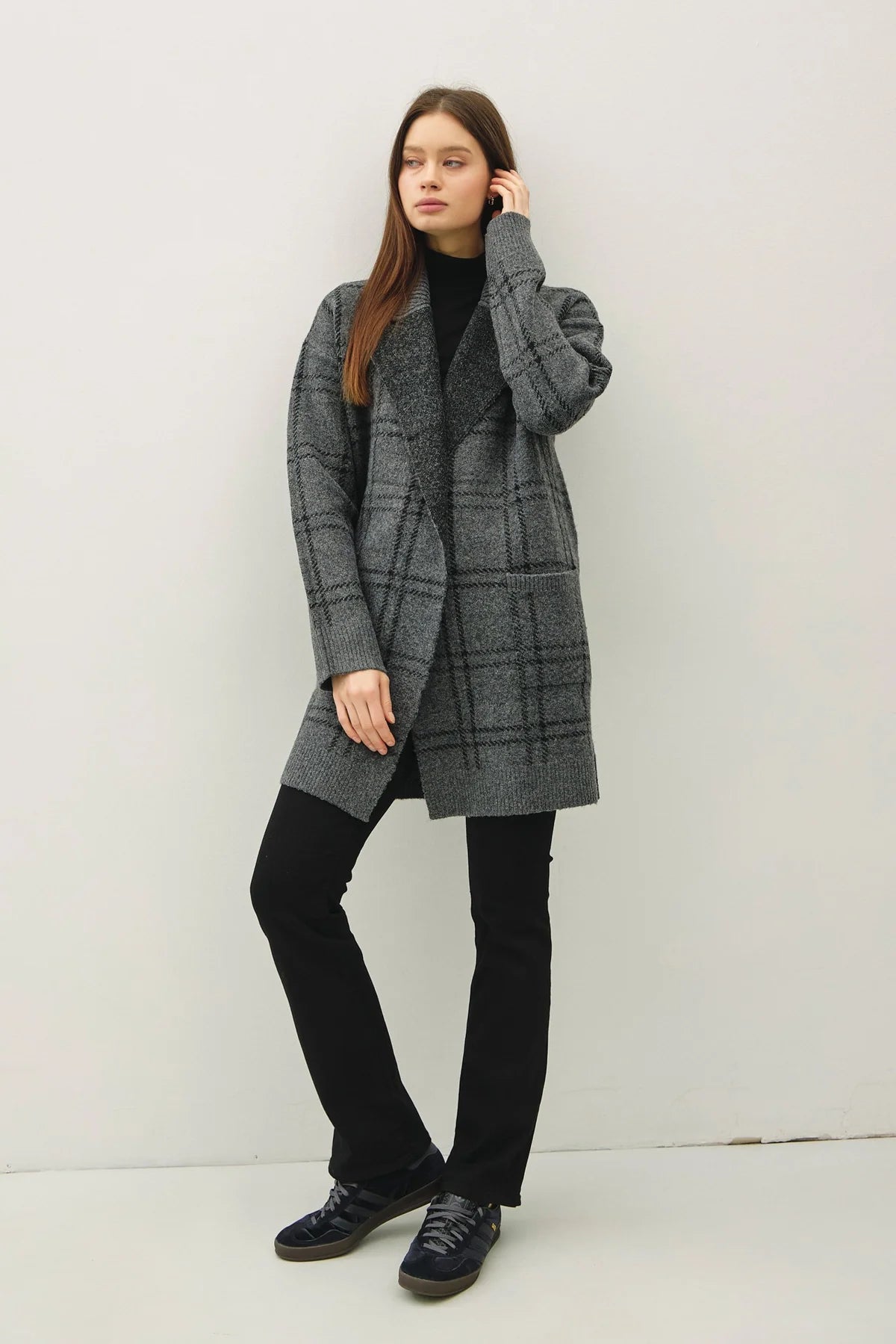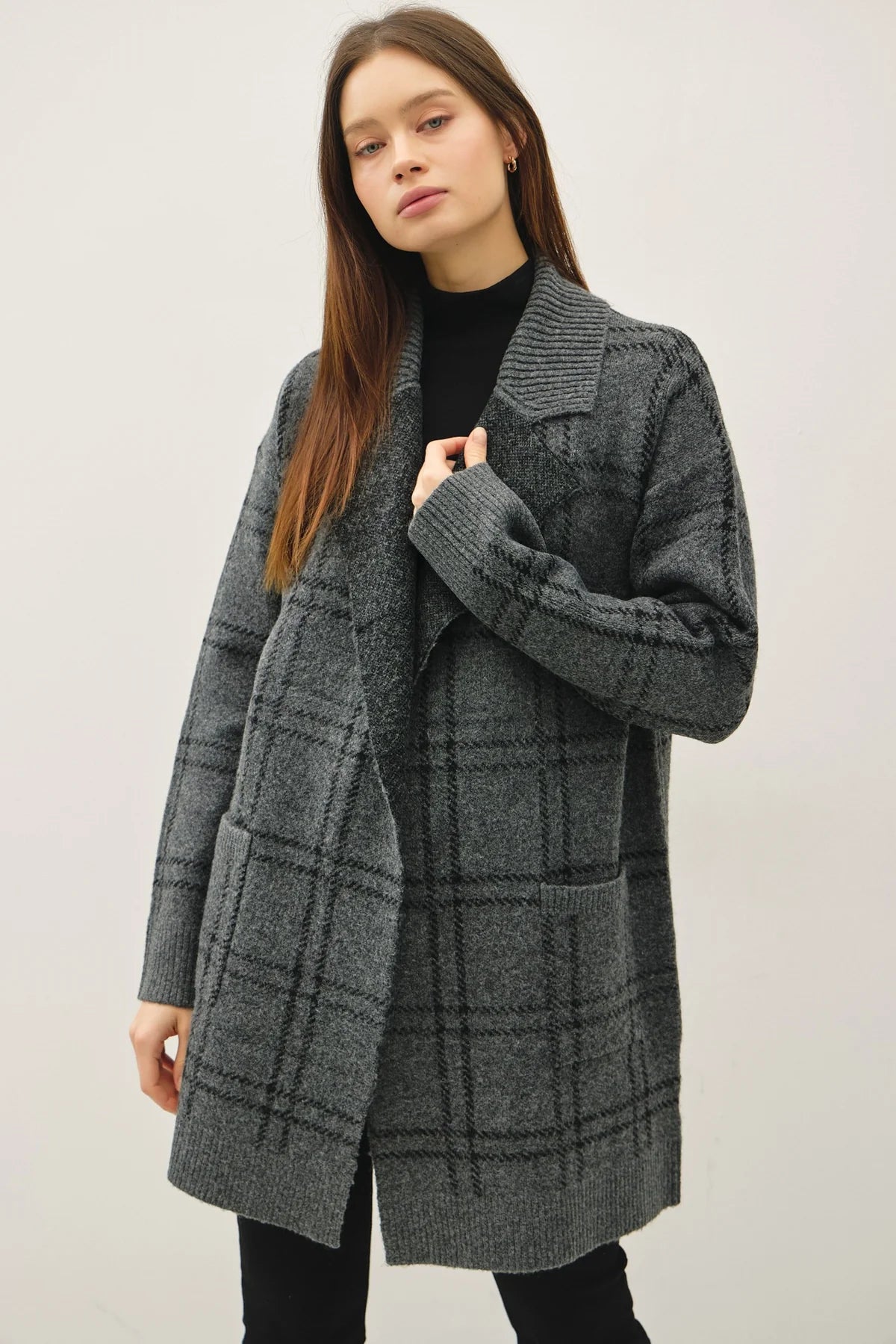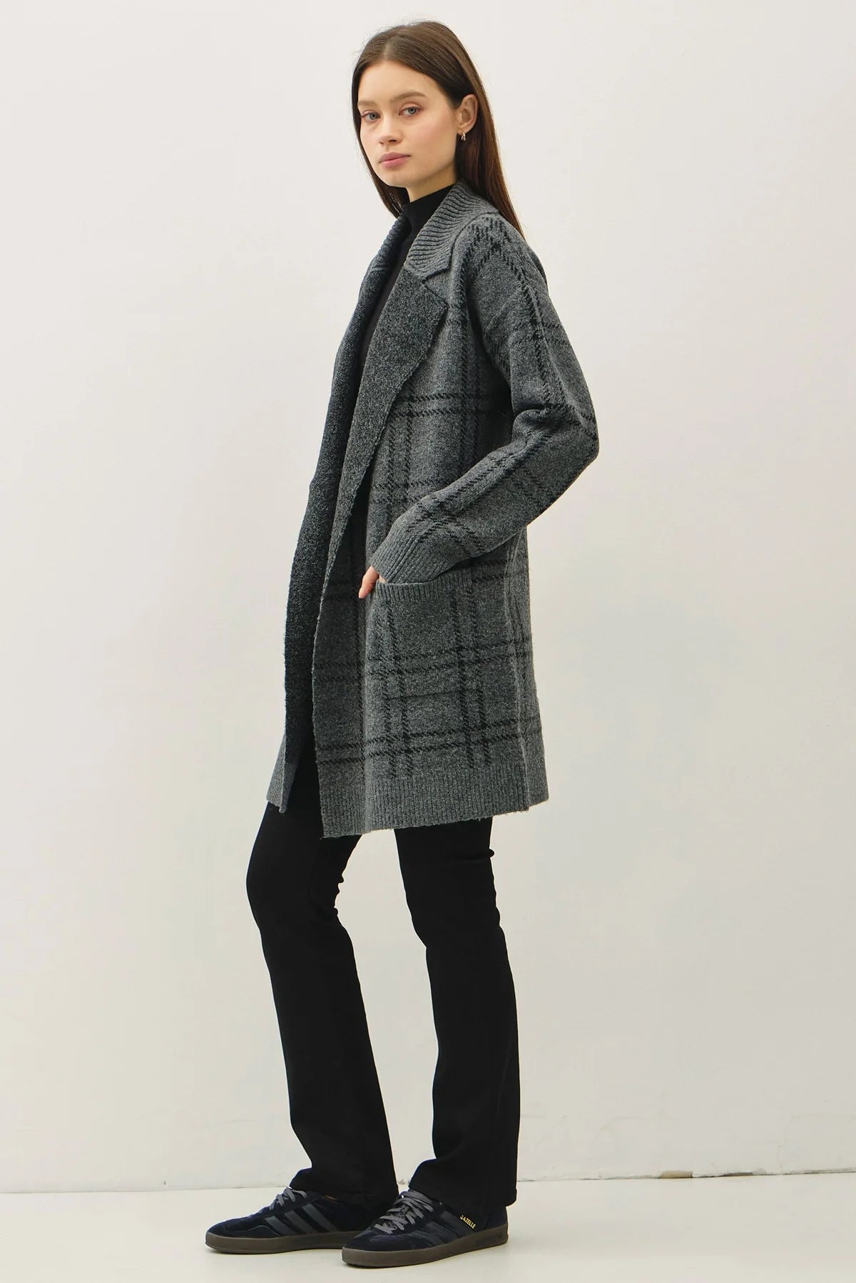 Wrap yourself in cozy charm with the Emory Plaid Coatigan. Featuring a soft plaid jacquard knit and an open front with lapel collar, this long sleeve sweater blends the best of a cardigan and a coat. Perfect for layering in fall and winter, it offers warmth without sacrificing style—comfortably playful for any chilly day adventure.