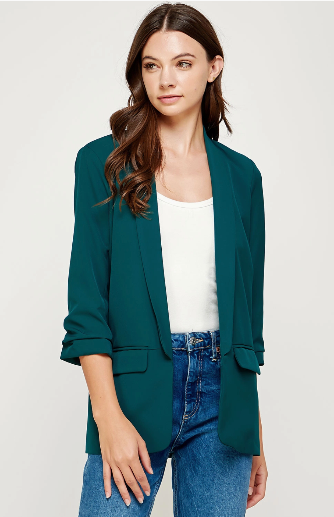The Boyfriend blazer in stretch suiting crepe fabric. This style features ruched 3/4 sleeves, shoulder pad, dropped shawl collar, 2 flap pockets at front, a relaxed fit and full lining.